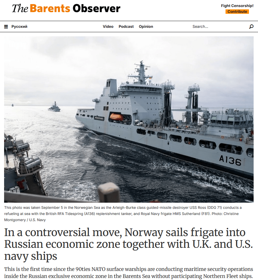 For example HMS Sutherland, accompanied by Royal Fleet Auxiliary Tidespring, and two other NATO warships penetrated 160 miles into Russia’s Exclusive Economic Zone and lingered 40 miles from Russia’s Severomorsk naval base. There was no pretence they were doing anything other than gathering intelligence and sounding out defences.