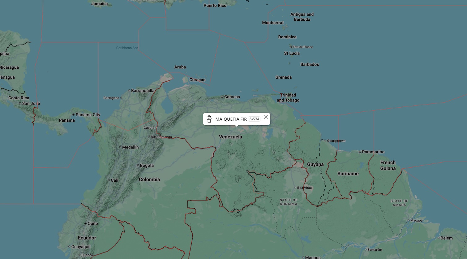 The FAA NOTAM covers the MAIQUETIA (SVZM) flight information region. Flight information regions are how air traffic control authority is divided around the world. They are not national boundaries. Venezuela manages the MAIQUETIA FIR, which includes all of Venezuelan land and extends into the Caribbean Sea approximately 350 miles at its furthest point.