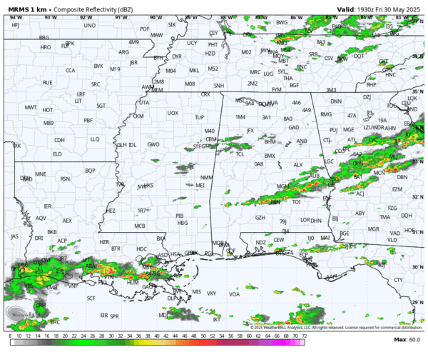 RADAR CHECK: A band of showers and thunderstorms ahead of a cold front is pushing through Southeast Alabama this afternoon. Some of the storms could produce small hail and gusty winds this evening. Much drier air will follow the front, setting the stage for a very pleasant night. The sky becomes mostly clear, and temperatures drop into the 50s over the northern half of the state by daybreak tomorrow.