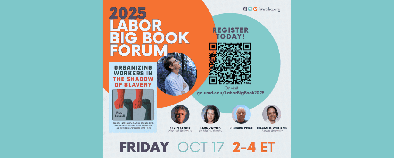 On October 17, historian Rudi Batzell presented at the Labor 2025 Big Book forum about his new book, Organizing Workers in the Shadow of Slavery: Global Inequality, Racial Boundaries and the Rise of Unions in American and British Capitalism, 1870-1929 (2025). Julie Greene moderated the forum. Comments were provided by Lara Vapnek (St. John’s University), Kevin Kenny (New York University), Richard Price (University of Maryland), and Naomi R Williams (Rutgers).