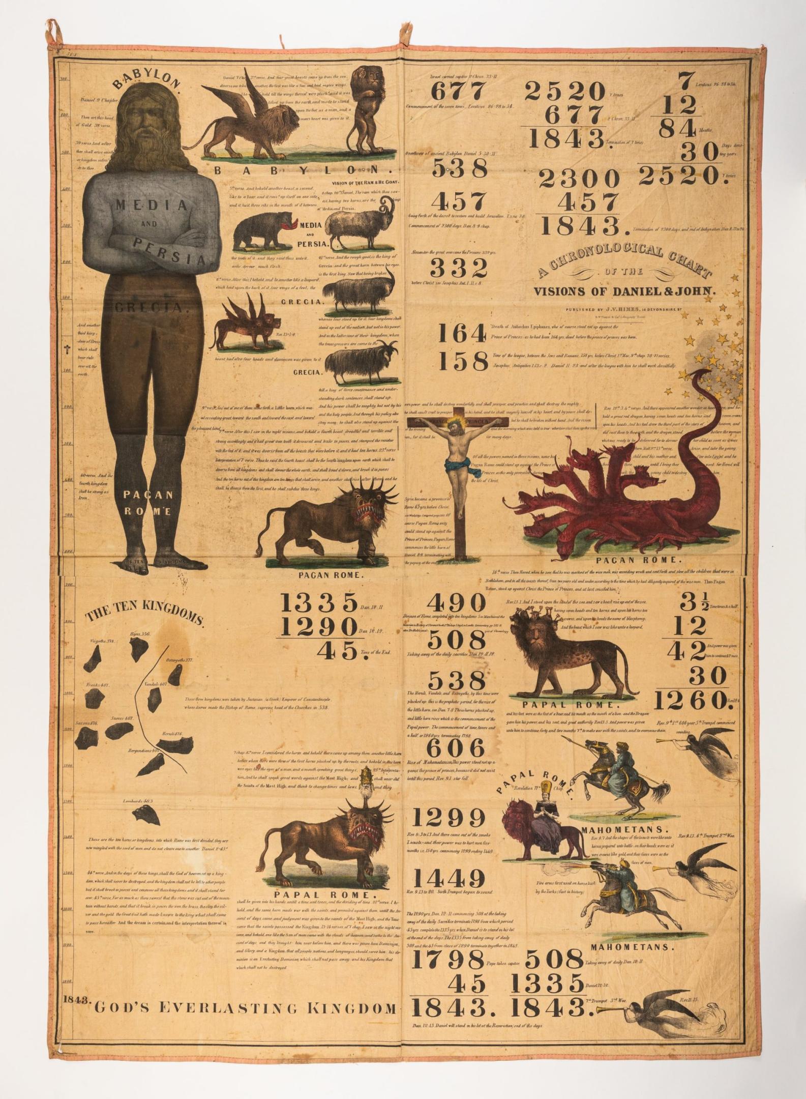 Unlike these mass-produced fabrics, most of the 150 cloth printings at AAS were created in small quantities in the newspaper shops and printing houses of urban areas from Boston to San Francisco. Why did printers choose to make these objects on fabric when paper was the standard and easier to procure? Practicality was often a factor. A religious banner used by Millerites to predict the end of the world was likely printed on textiles to ensure easy transportation from one camp meeting to the next.