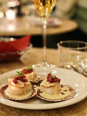 geserveerd in hun schelp en de combinatie met bacon en de romige beurre blanc
