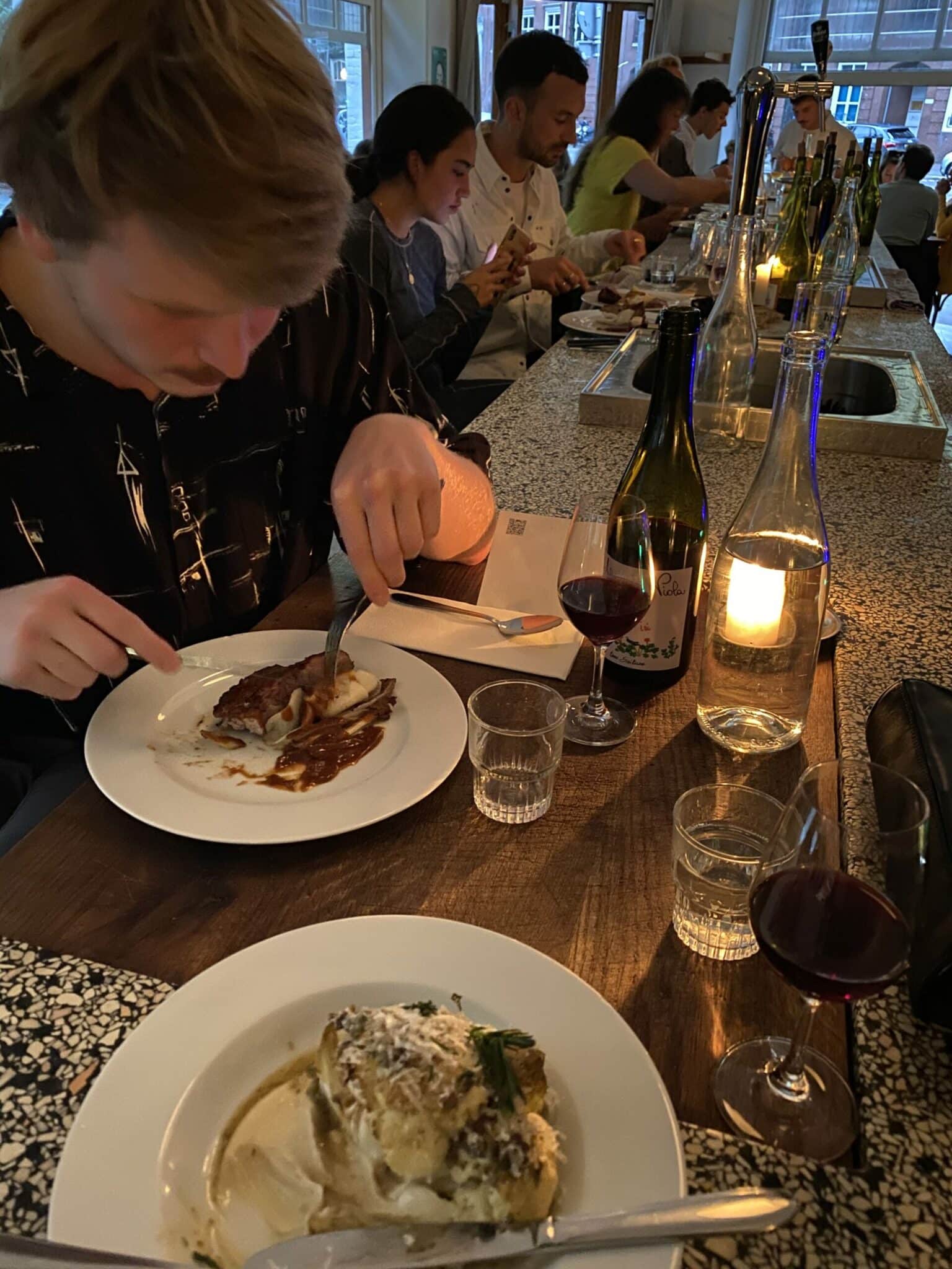 The interior is like an old French cafe, with old wooden tables and cozy candlelight. For me, the atmosphere is really important for feeling at home in a restaurant. Besides the interior, I really love their wine selection. The wines are all natural wines, which means nothing was added to the process of making the wine.