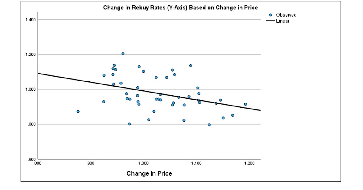 As prices increase, rebuy rates decrease … as expected. In this case, if prices increase by about 20%, rebuy rates decrease by about 11%.