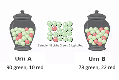 For the example depicted in Figure 1, suppose you have a sample of 20 balls where 18 are green and 2 are red. Is this sample more likely to have come from an urn with 90% green balls (Urn A) or one with 78% green balls (Urn B)?