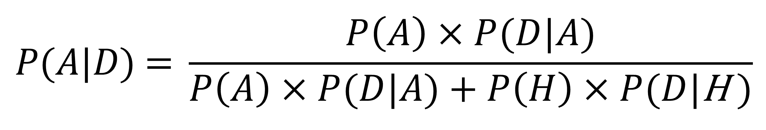 which equals 0.00075/(0.00075 + 0.000275) = 0.00075/0.001025 = 0.732 (73.2%). Because P(A|D) + P(H|D) = 1, P(H|D) = 0.268 (26.8%).