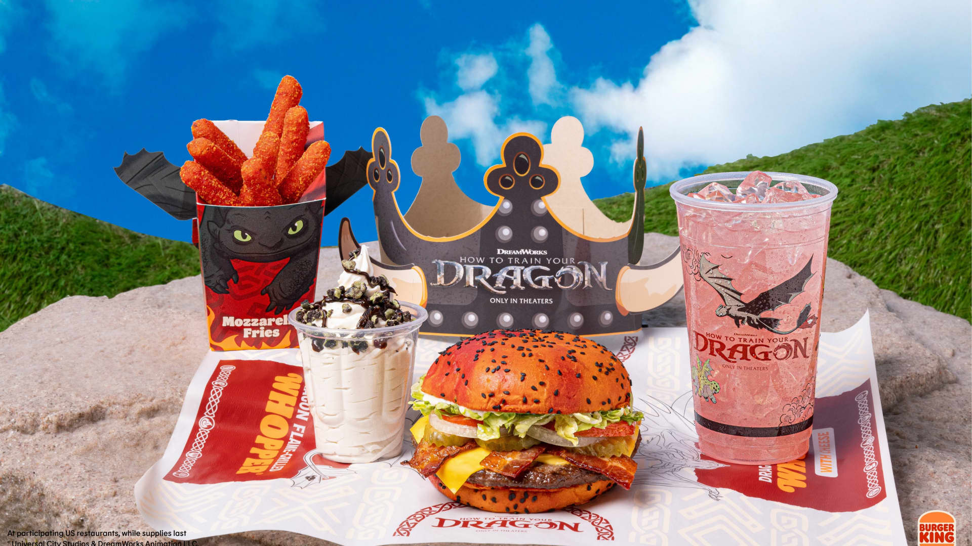 Burger King’s “How to Train Your Dragon” menu items include the Dragon Flame-Grilled Whopper, Fiery Dragon Mozzarella Fries, Soaring Strawberry Lemonade and the Viking’s Chocolate Sundae.