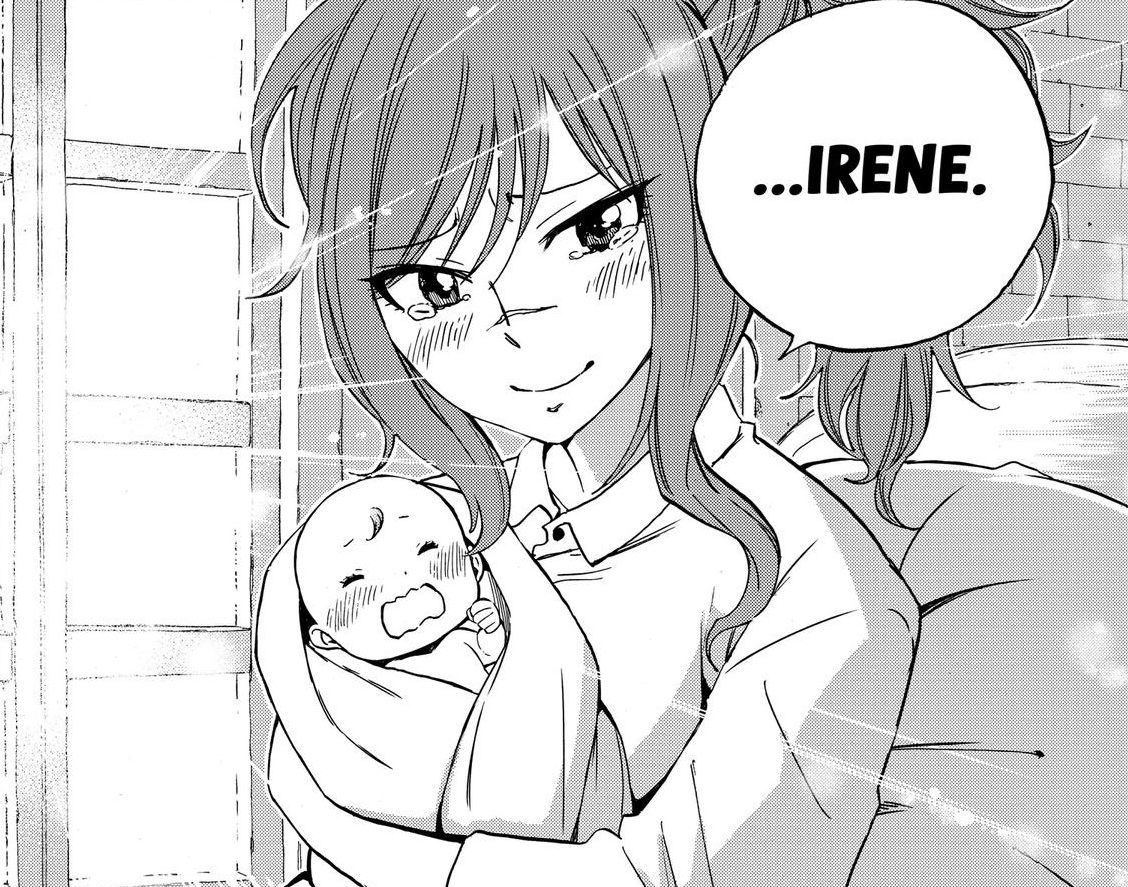 Meanwhile in Edolas, Erza Knightwalker gives birth to a daughter, whom she and her husband Mystogan name Irene.