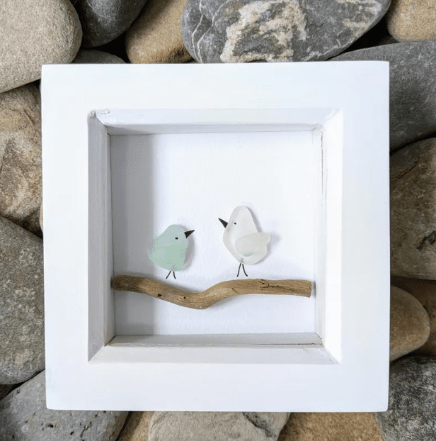 I found sea glass on Etsy and there are artists who make jewelry from sea glass. Something else that caught my eye was bird art using drift wood with sea glass birds on it!