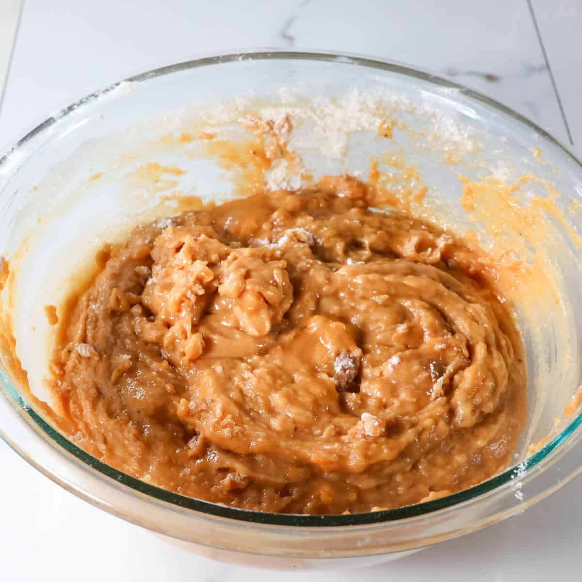 Combine dry ingredients with wet ingredients and  fold in pecan