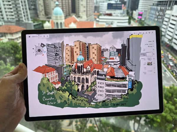 For drawing purposes, you may want to change the colour mode in Settings from Standard to Color profile. Doing so will actually make colours appear less saturated in drawing apps, but will match the colours better on other displays. For the sketch above, the red roof was really vibrant but the exported artwork has more muted colours. If you want other people to see the same colours as you when you share your art on social media, choose Color profile mode.