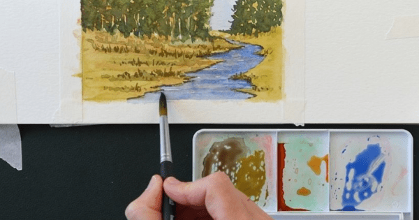 Underpainting in watercolor involves applying a light layer of paint to establish the basic tones, values, and/or mood of a painting. It also can serve as a way to establish values. We’ll paint a tree with an underpainting on the right side and no underpainting on the left so we can compare halves.