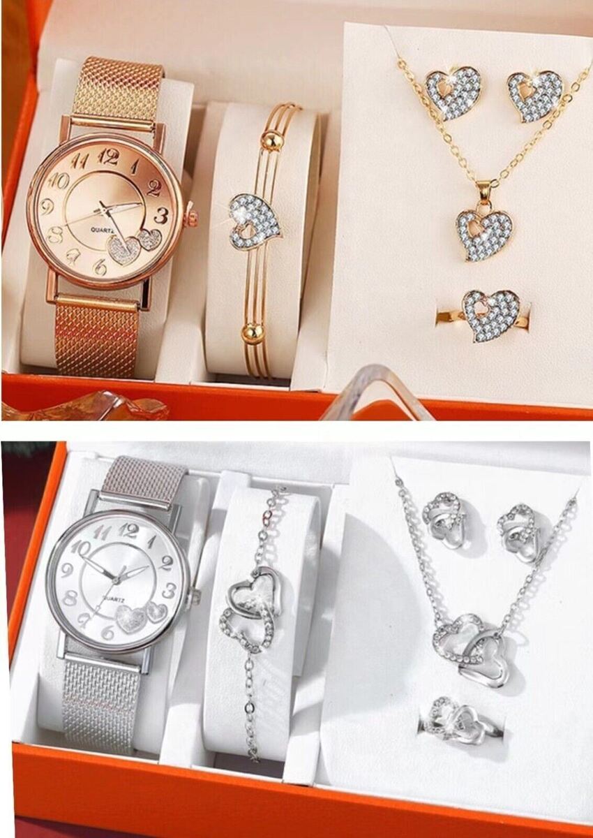 Watch Bracelet Necklace Earrings Gift Box Set Women Girls Christmas 5 Pcs Set