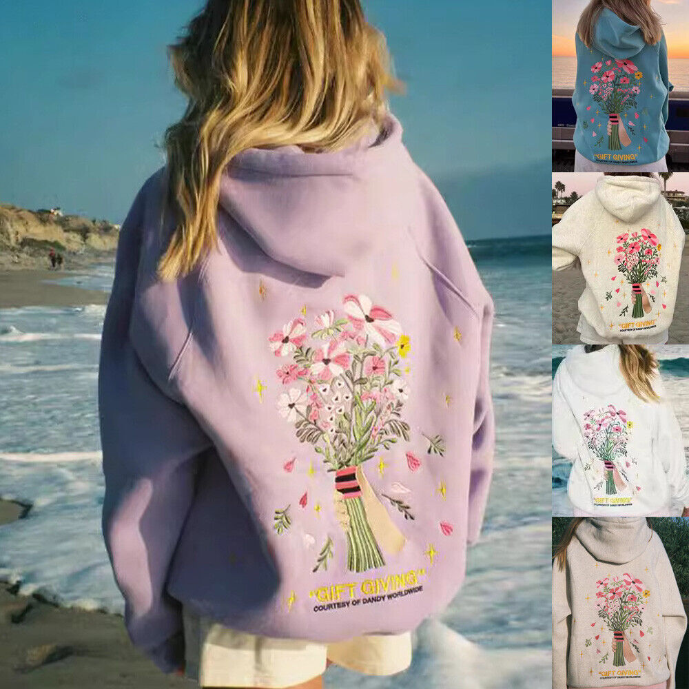 Womens Oversized Floral Print Hooded Sweatshirt Jumper Hoodie Pullover Tops 6-26