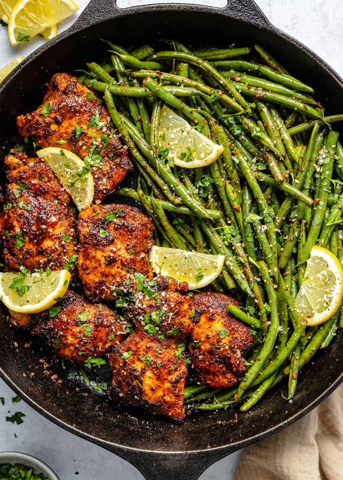 Push the green beans to the side and return the chicken to the pan. Garnish with chopped parsley, lemon slices, or freshly grated parmesan cheese, if desired.