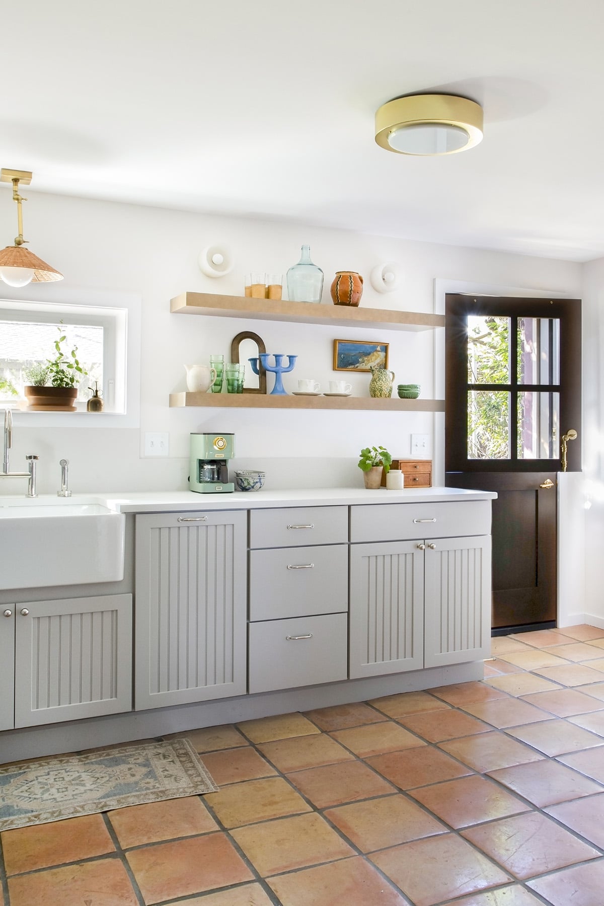 When it came to choosing the style of cabinetry, beadboard was always my first inclination. I was inspired by a furniture cabinet piece that I had originally thought about using for the space (which didn’t work out) and had beadboard detail, so the idea just stuck with me. But before I made that call, I decided to focus on the finish. After pulling a lot of inspiration, I knew I wanted to do either a light wood, a creamy white, or a sage green for the cabinet color. Once we knew we were keeping the terra cotta floors, that quickly ruled out wood for me. And while cream would have been just fine, it would also have been the exact same color as our main kitchen, and that felt a bit boring. A quick look at the options offered by Diamond cabinets showed three shades of green: one that was more of a gray with a green undertone (Limestone), one that was a midtone green with quite a bit of blue in it (Seaside), and one that was a classic dark green (Foxhall).