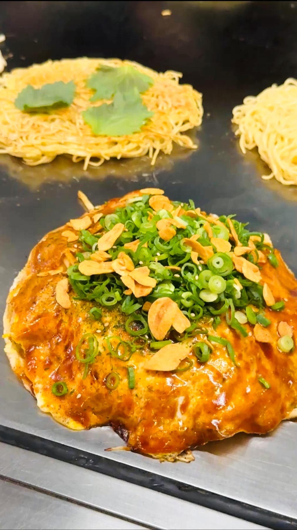 For lunch, we visited Nagataya, a popular spot known for Hiroshima-style okonomiyaki. This version is layered with noodles and vegetables and is cooked right on the griddle. We tried both the vegetarian and seafood versions and were happy to see that they also offered vegan options. It was comforting, flavorful, and such a good meal after a long morning.