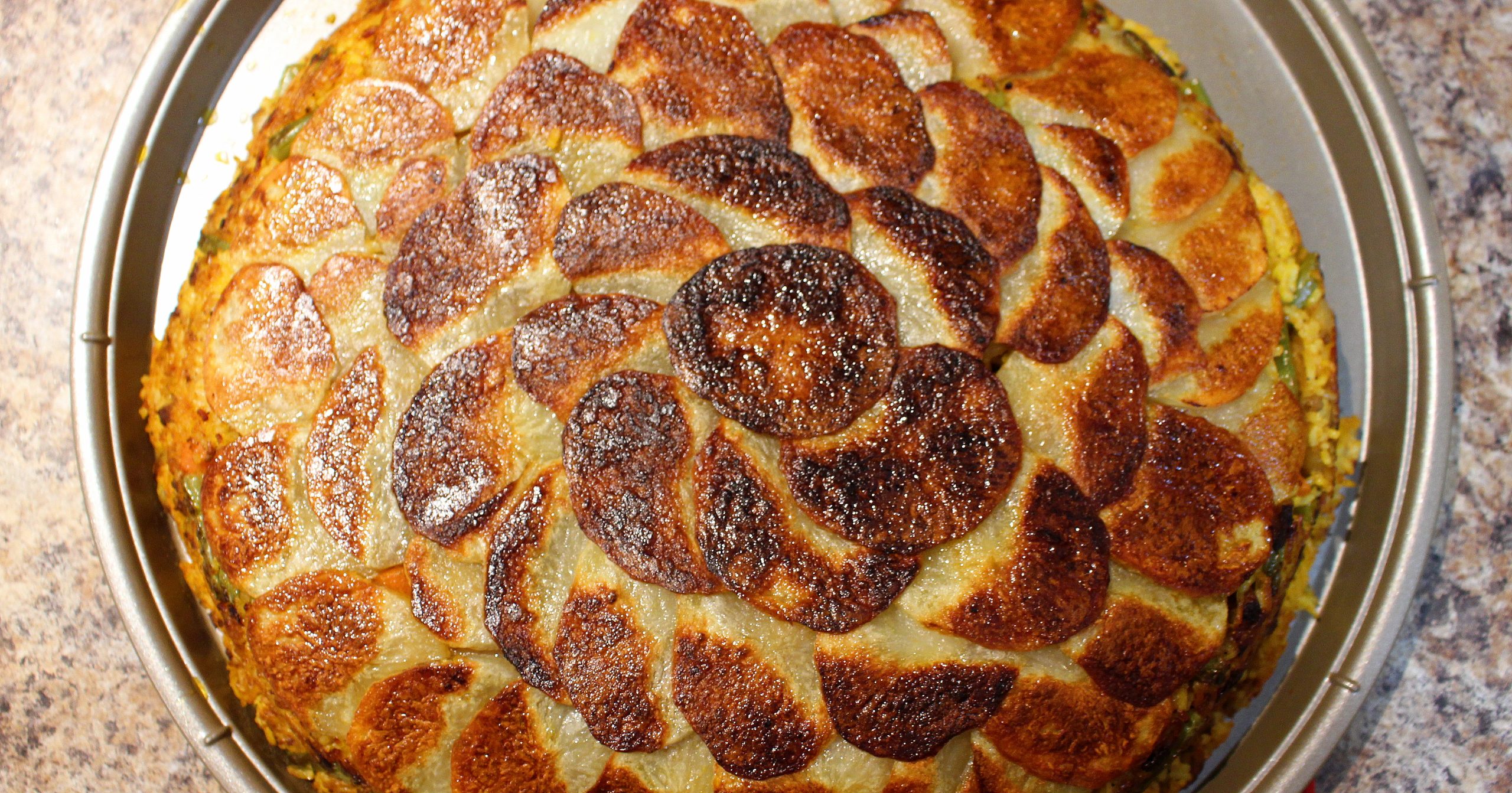 To serve, this whole thing is inverted sort of like a Bundt cake. It is heavy though so get a helper or strong assistant to turn the pan since it is very hot. Otherwise, serve with a spatula and turn it over as you serve so you can see your potatoes.