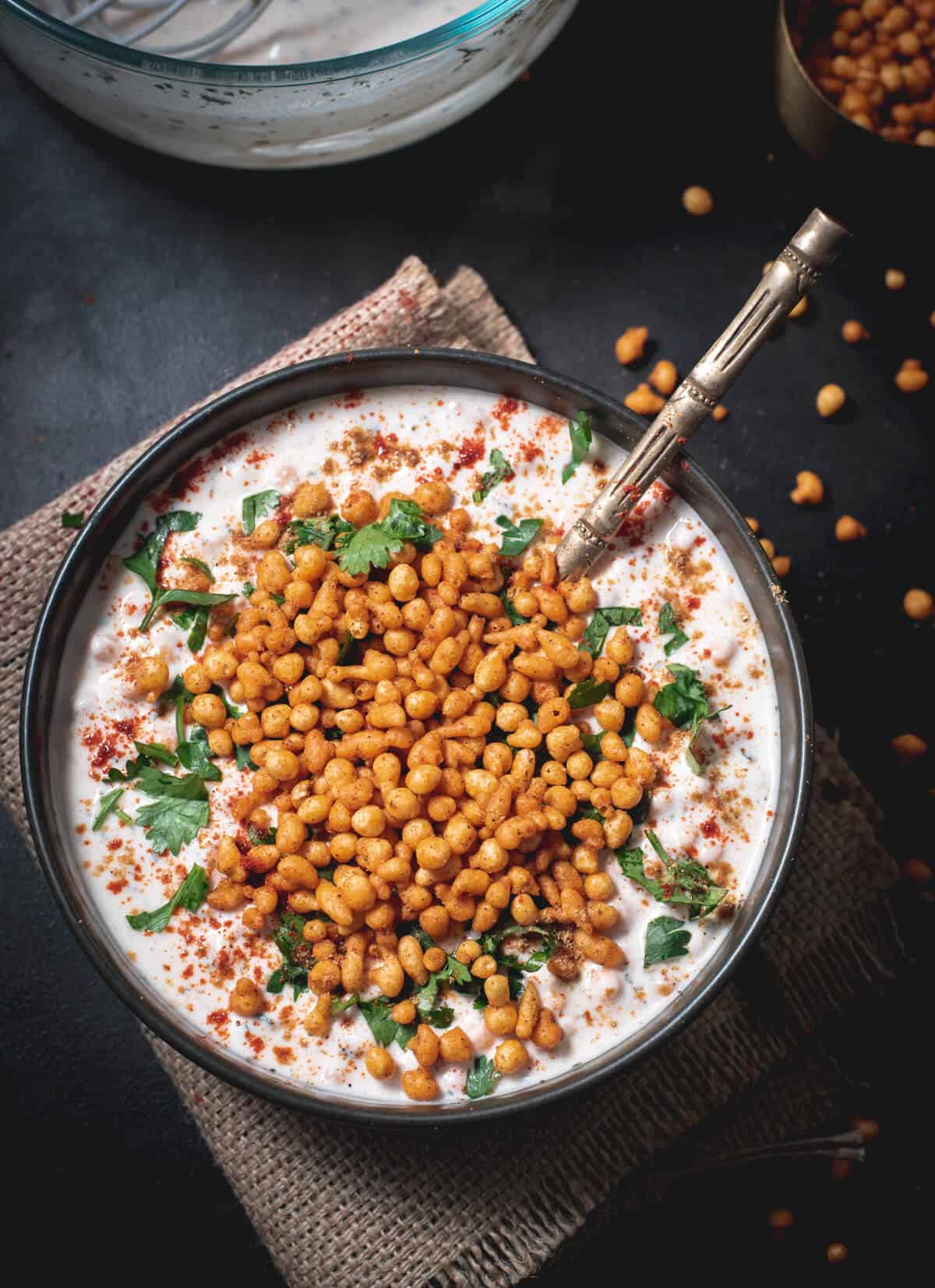 Boondi raita is made by soaking crispy chickpea flour balls in spice-infused creamy yogurt. Serve it with biryanis or with rotis and a side dish – it is the perfect way to wrap up your meal.