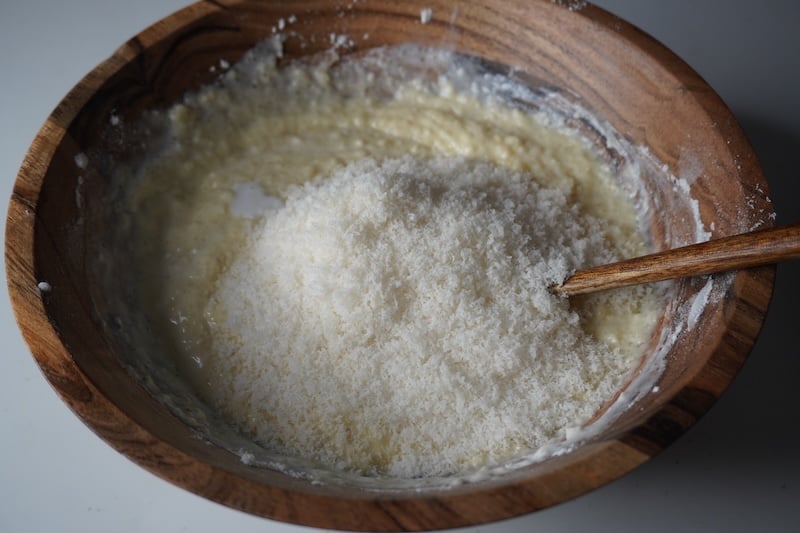 Now add in baking soda, baking powder and salt. Mix it really well. Add in plain flour and coconut milk and gently fold the batter. Don’t over mix the batter. Finally add in desiccated coconut and combine into the batter.