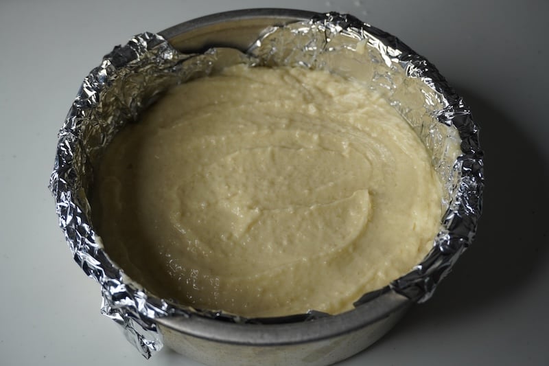 Take 8 inch round baking pan. Line the bottom of the pan with a parchment paper or aluminium foil and butter it on all sides generously. Set this aside till use. Preheat the oven to 180 degree C / 360 Degree F.