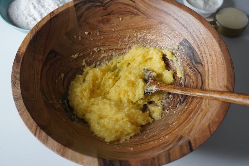4)Add in sweetened condensed milk. it helps bind the batter well and acts as an egg substitute.