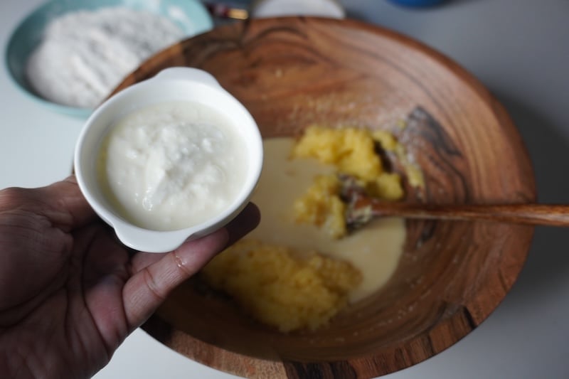 Take butter, sugar, vanilla extract and coconut extract in a bowl and cream together. Now add in coconut oil, yogurt, condensed milk and mix well till combined.