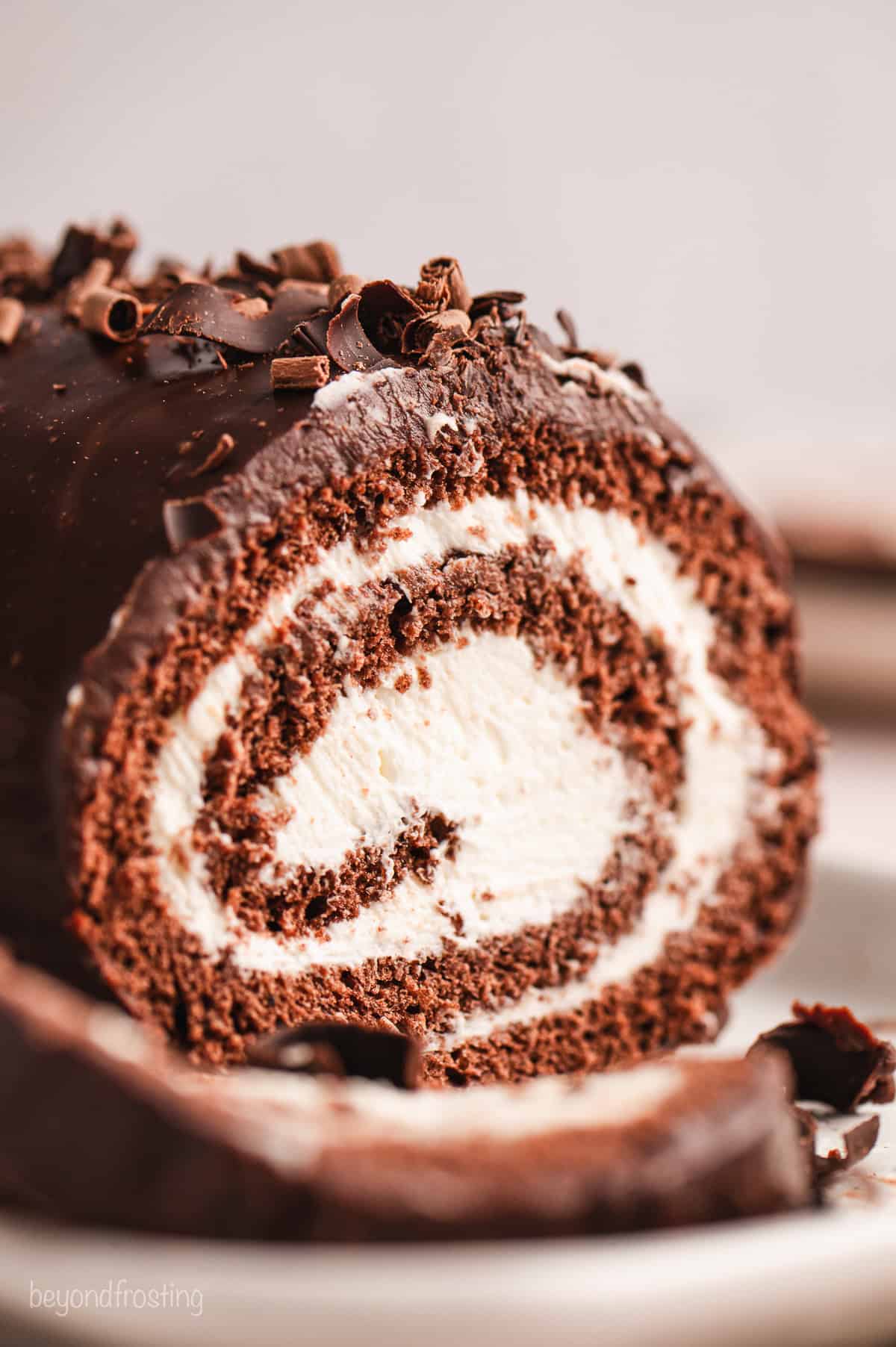 A Swiss cake roll for a crowd, this chocolate cake roll is a moist chocolate sponge cake rolled with a rich cream cheese filling, covered in smooth chocolate ganache.
