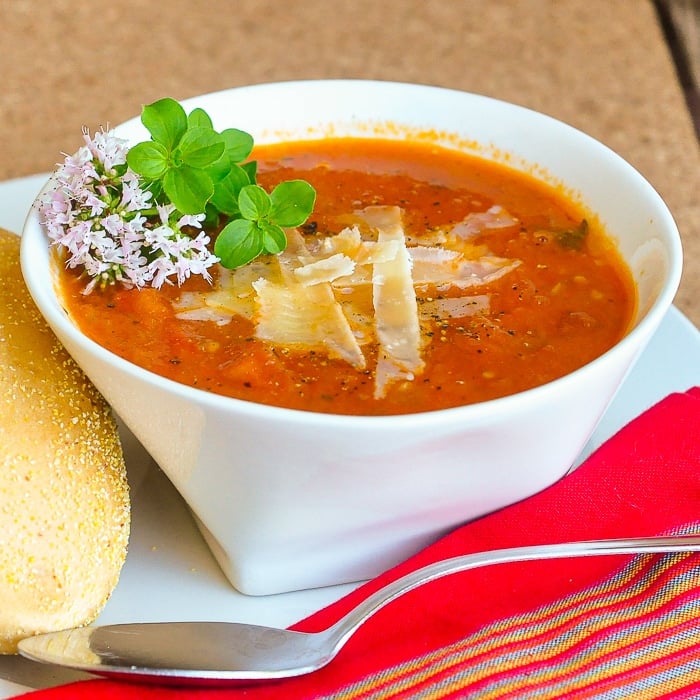Although this is meant to be a chunky tomato soup, it is easily pureed as well if you prefer a smooth tomato soup. The pinch of brown sugar added to the soup just brings out the natural sweetness of the ripe tomatoes.