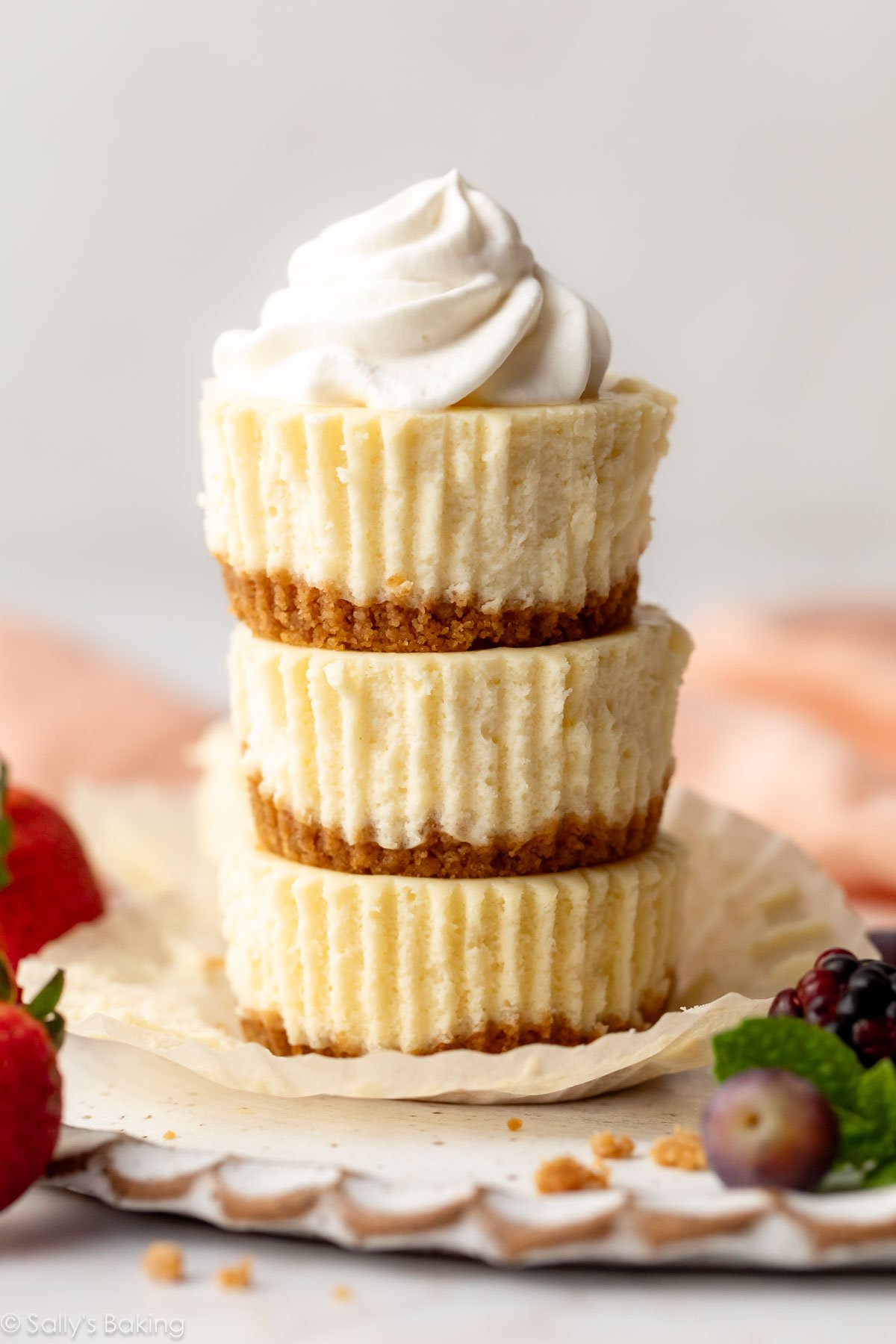 This recipe for individually sized cheesecakes is so simple and the perfect dessert to make for a smaller crowd. The classic cheesecake flavor is a great base for any of your favorite toppings, like whipped cream and berries, salted caramel, chocolate ganache, or raspberry sauce. Have fun with it!