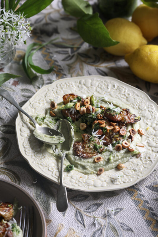 Crispy Smashed Parmesan coated new potatoes with wild garlic hazelnut pesto and lemony white bean puree