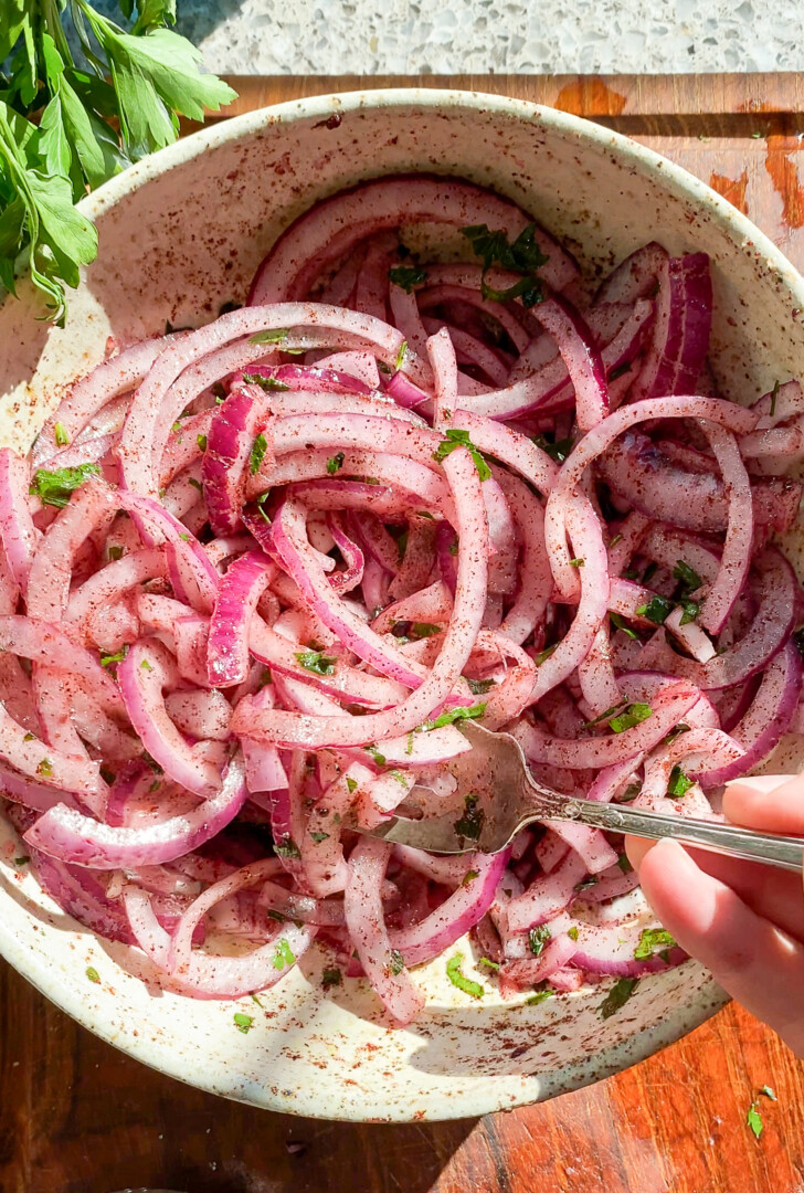Place in a bowl and add the lemon, sumac, salt, parsley, and olive oil, if using. Toss together to combine and coat the onions.