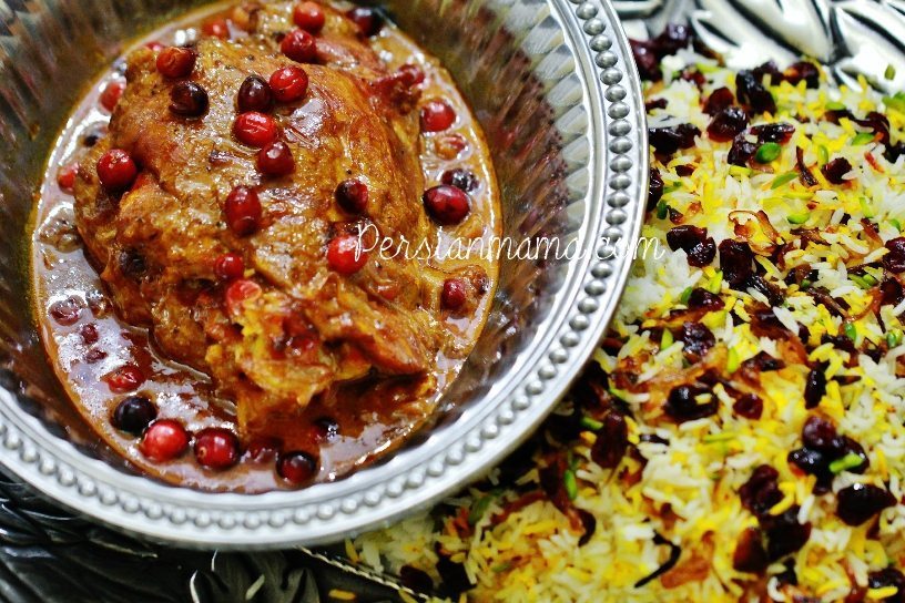 The ingredients and makeup of this dish is different from the traditional turkey dinner, or the usual Iranian zereshk polo ba morgh. However, turkey has never been so juicy and tender, and the cranberries make a delicious substitute for the popular zereshk. Barberry, or zereshk, is the small tart berries of a thorny bush that grows only in certain parts of the world, and Iran is one of the main producers of culinary zereshk, that grows in the Khorasan Province in the northeast.