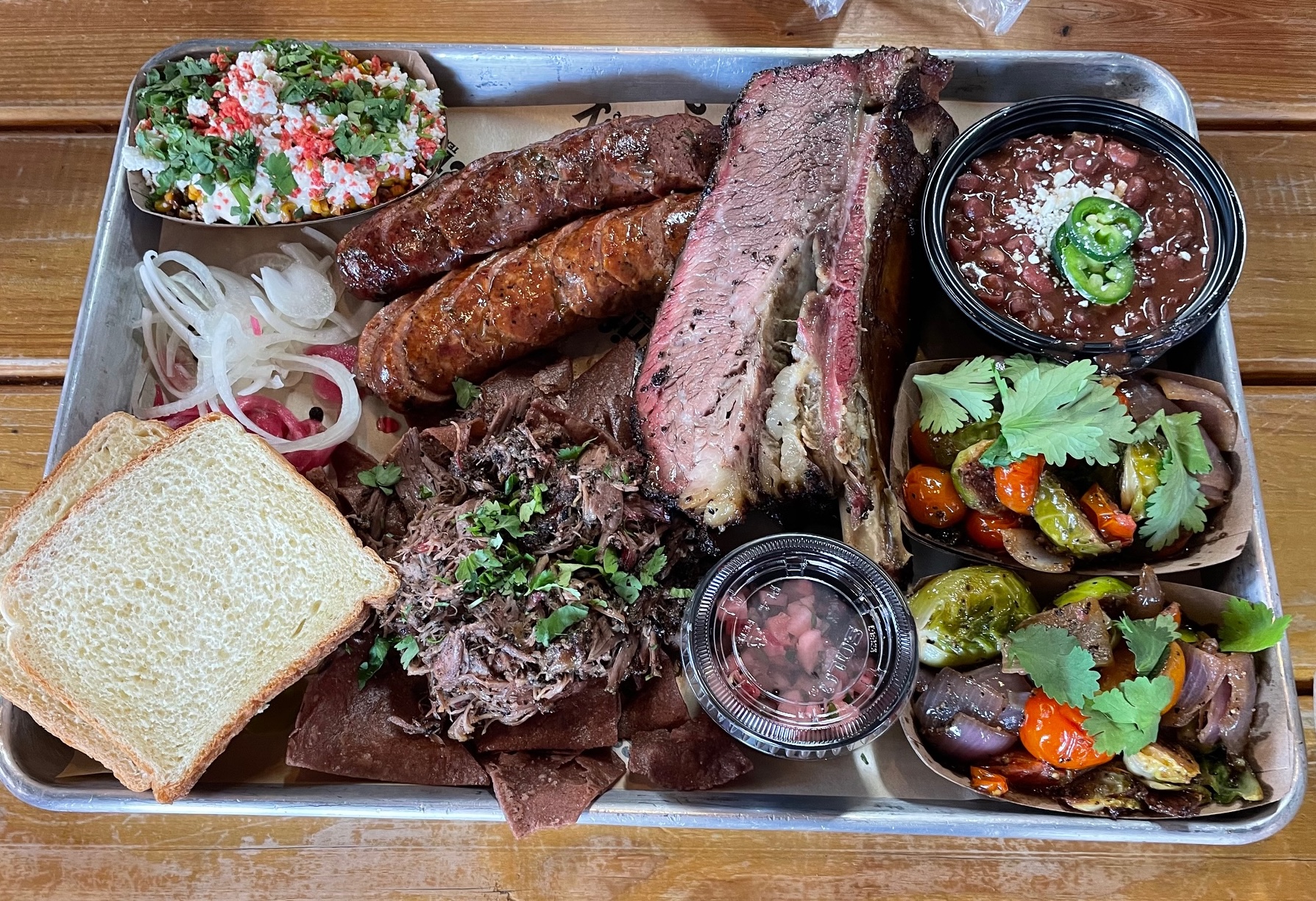 I’d chosen the beef rib, a half pound of smoked lamb, one each of poblano and spicy cheddar sausages, two orders of grilled vegetables, sweet corn off the cob, and savory brisket beans.