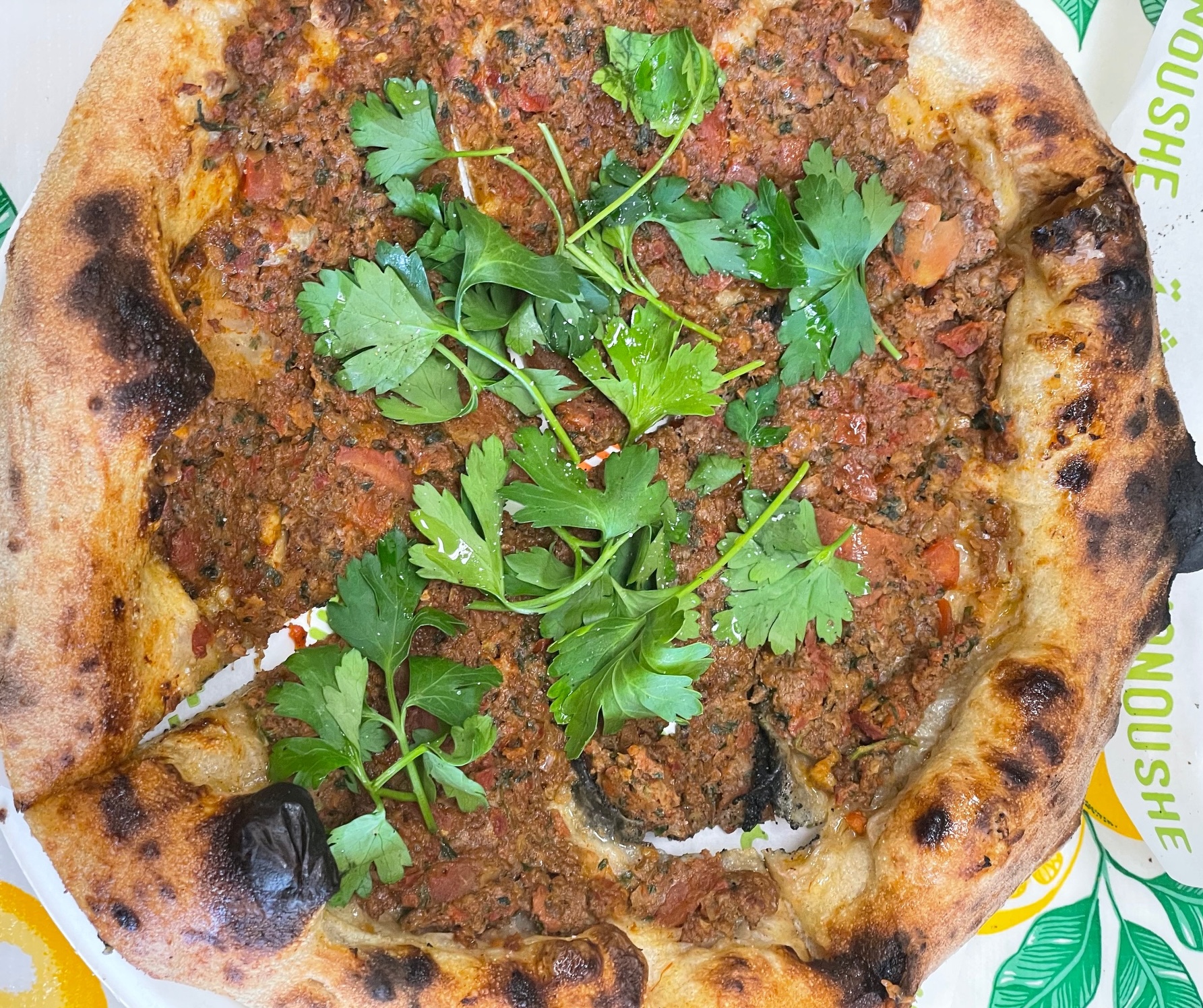Z&Z’s menu offers nine manoushe varieties. Here’s the Lahm bi Ajeen with ground beef, onion, and peppers — and unspecified spices that another patron — a regular — had ordered.