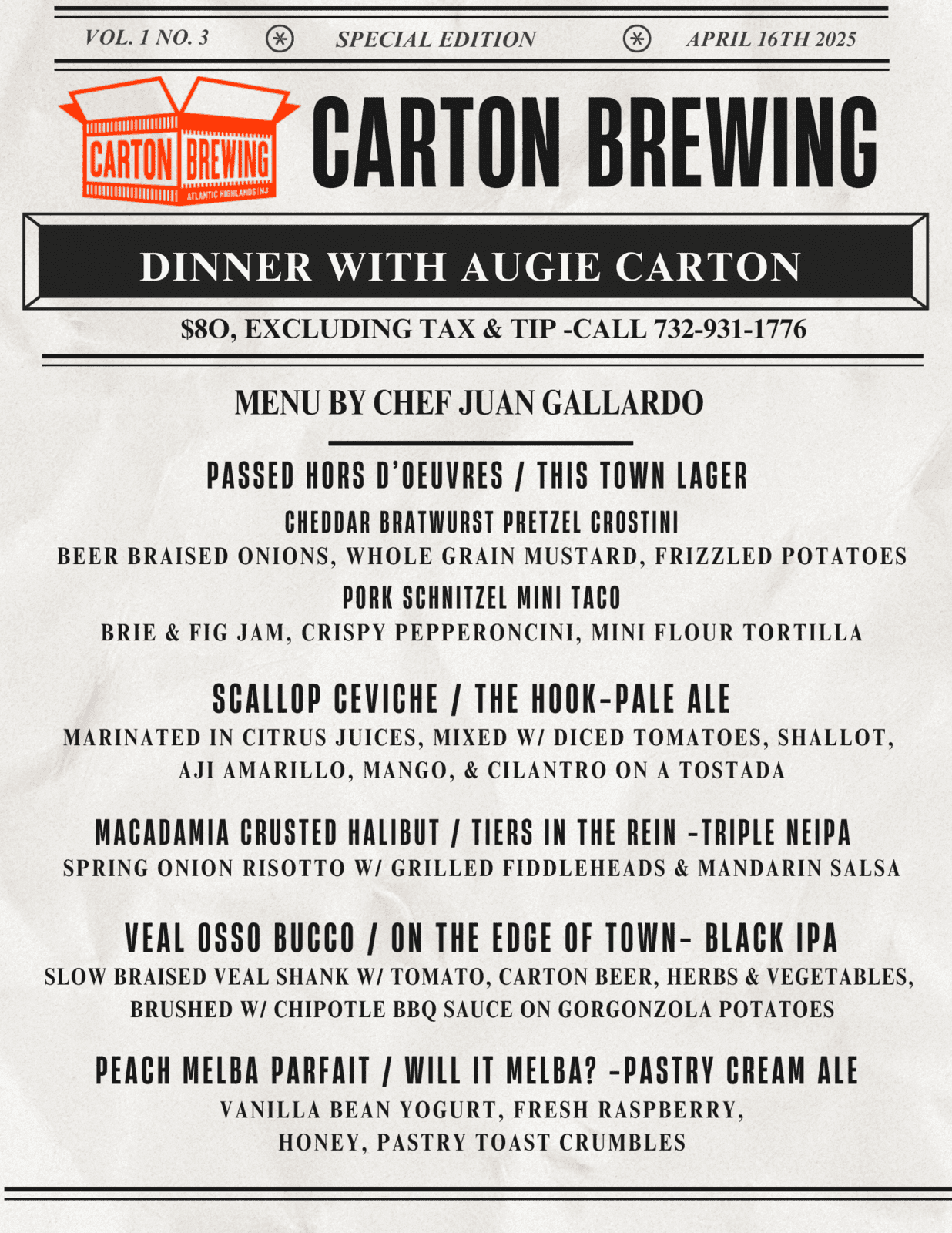 Join us for a Saturday Evening Beer Dinner accompanied by the renowned brewmaster, Augie Carton! This promises to be an unforgettable evening exploring the world of Carton Beer, a NJ standout. Chef Juan has prepared a special menu for the night!