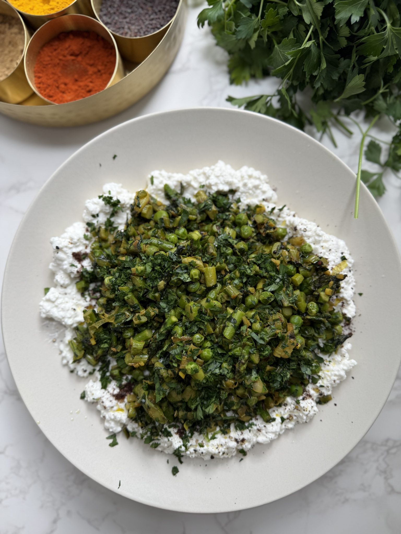 Plate the cottage cheese and sprinkle with salt, pepper and sumac. Spoon the greens over the cheese and finish with a squeeze of lime and fresh parsley and more sumac. Serve over crisp whole grain crackers for a fiber, micronutrient and protein packed light lunch or snack.