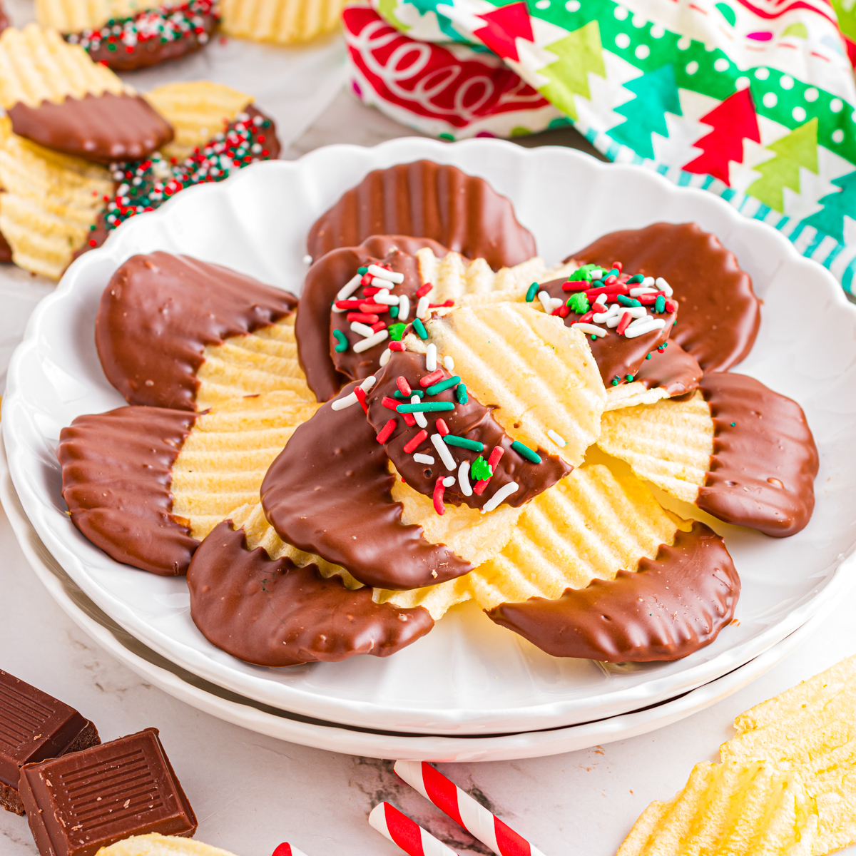 I love a good salty-and-sweet combination, and this Chocolate Covered Potato Chips recipe is perfect for satisfying the craving! I love making these for impromptu gatherings, movie nights, or Christmas parties, when I don’t have time to bake but can throw together a festive treat for everyone to enjoy! Now they’re a go-to treat anytime we want something fun and fancy-feeling with zero fuss. Bonus: They look so pretty in jars or gift bags with a bit of ribbon!