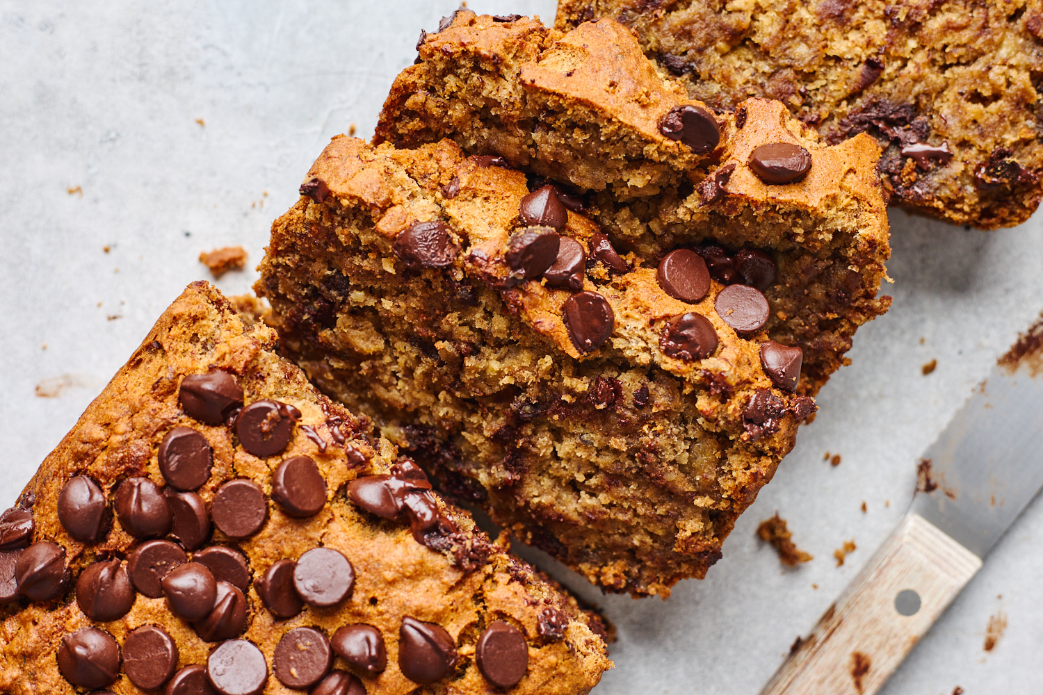 - Pour the batter into a loaf pan that’s lined with parchment paper so it hangs over two sides of the pan. sprinkle batter with more chocolate chips