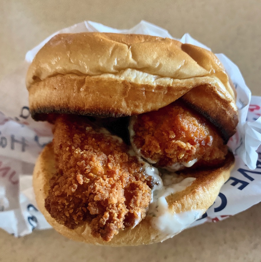 28 May 2020: In May, 2020, Lotaburger entered the chicken sandwich war with two options: Blake’s Chicken Sandwich (two chicken tenderloin strips, pickles and Blake’s sauce, our signature creamy green chile sauce) and the Buffalo Chicken Sandwich (two chicken tenderloin strips tossed in spicy Buffalo sauce, Ranch and pickles) that was filling, but not exactly brimming with deliciousness. In fact, the biggest impression it made was for its rather diminutive size. It’s not much bigger than a slider with perhaps a four-inch bun. The pickled onions left absolutely no impression and the Ranch sauce could have used more personality (green chile, anyone?).