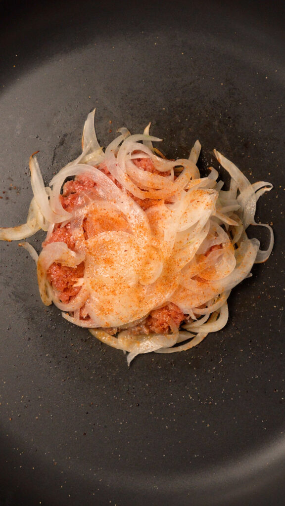 Once pan is preheated (after about 3-4 minutes) add a ball of meat to the center. Season with salt or pepper (I like to use Lawry’s Seasoned Salt). Then add about 1 – 2 ounces of the onions. Season some more, then smash with a burger press or stiff spatula.