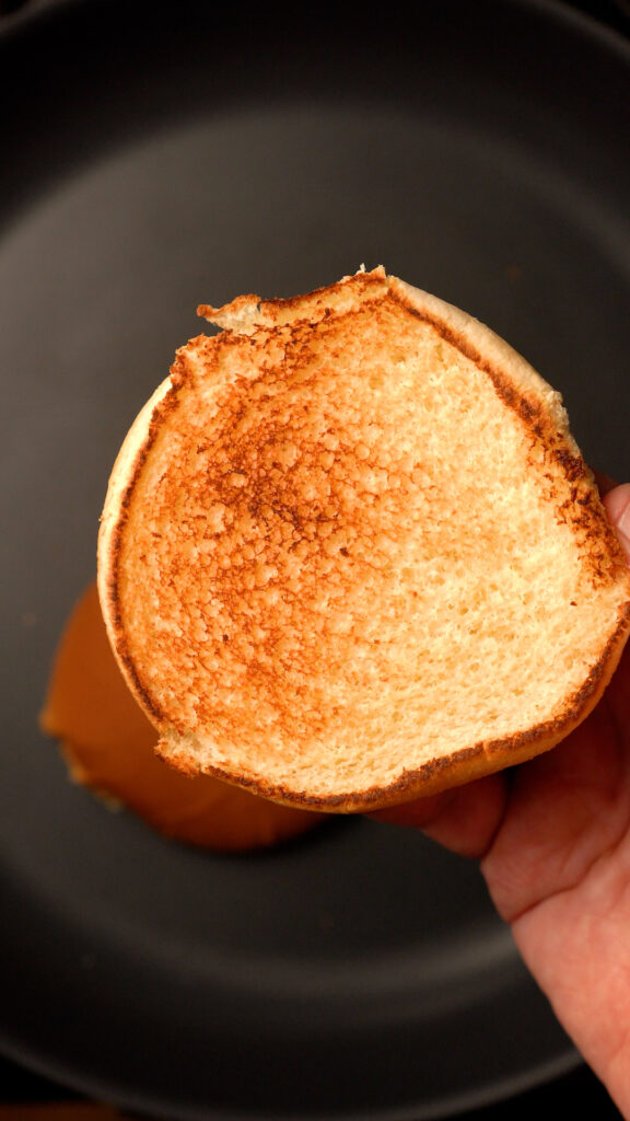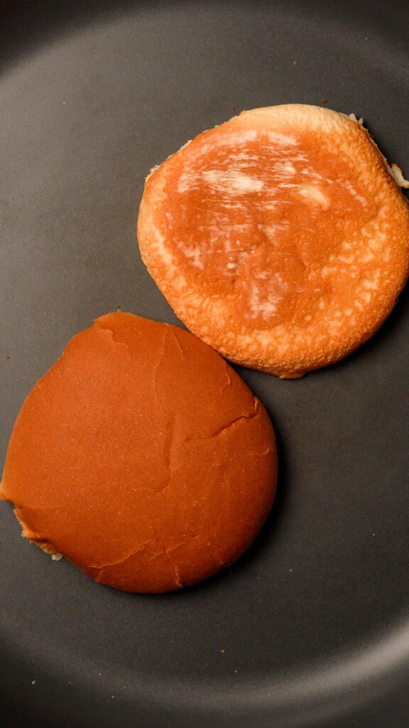 I like to dry toast my buns as the pan preheats, once they are lightly toasted, it’s a good sign the pan is hot enough for the burgers.