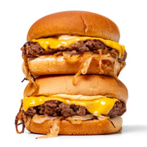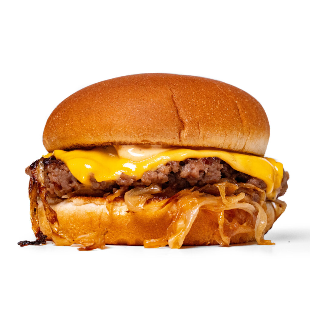 The famous Oklahoma Onion Burger made vegan! Tons of fried onions smashed into a plant-based meaty burger! Perfection!