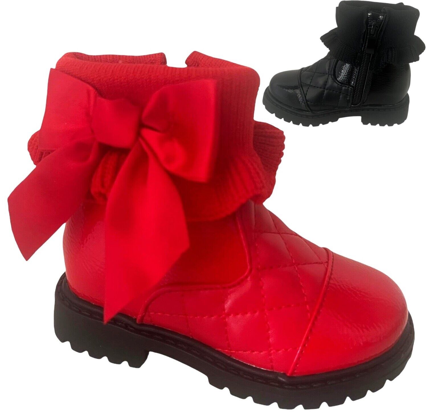KIDS GIRLS FLAT SPANISH BOW SATIN BABY INFANTS PATENT WINTER ZIP ANKLE BOOTS SZ