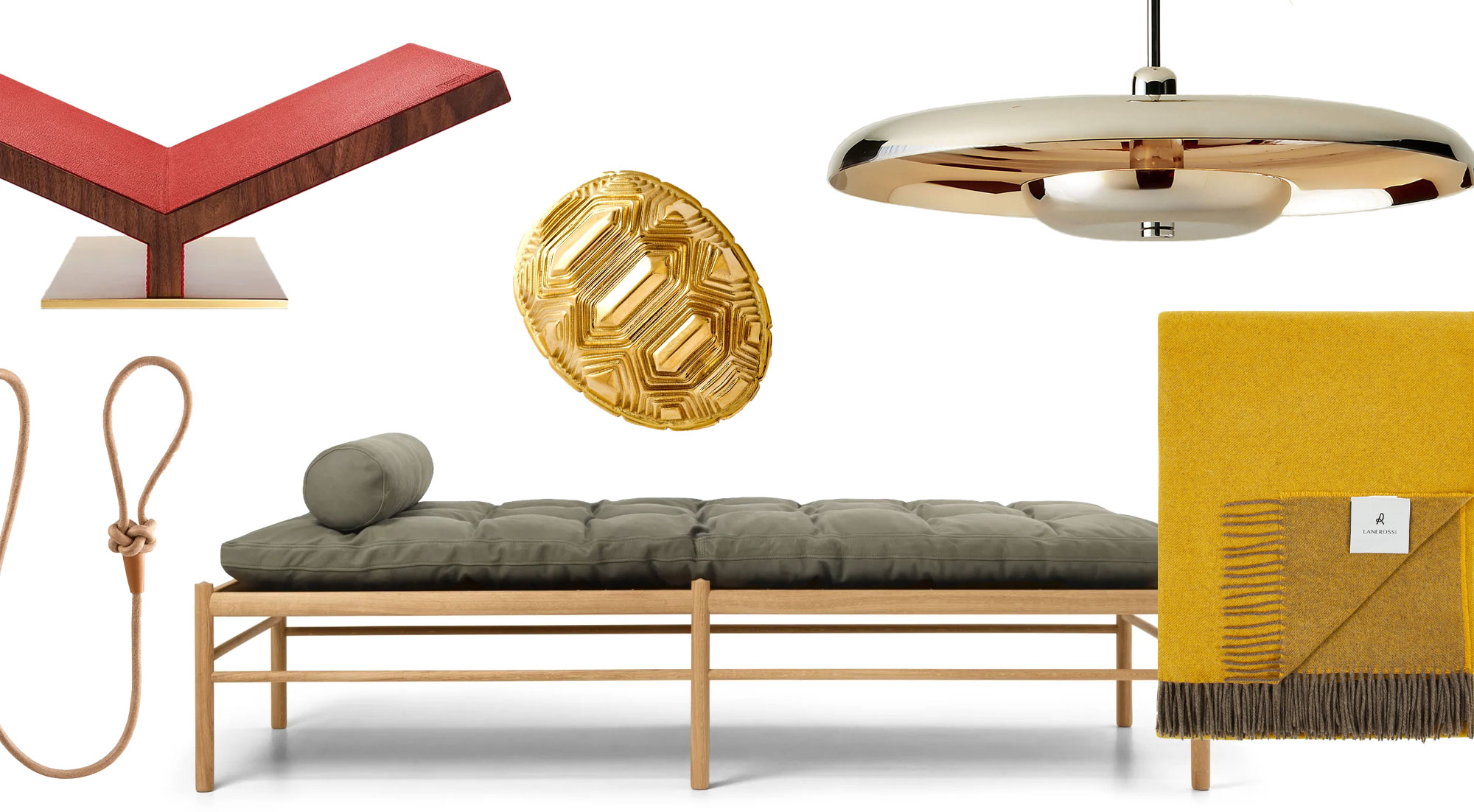 Clockwise From Top Left Red Leather Bookstand Polished Nickel Pendant Light Stoneware Bowls Reversable Cashmere Throw OW150 Daybed Tortoise Knob Leather Dog Leash & Collar