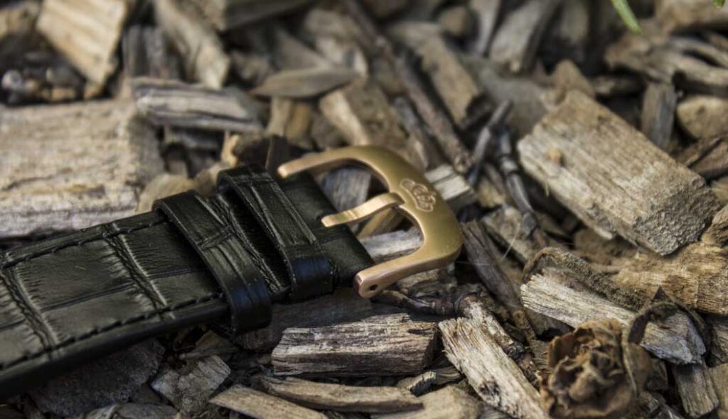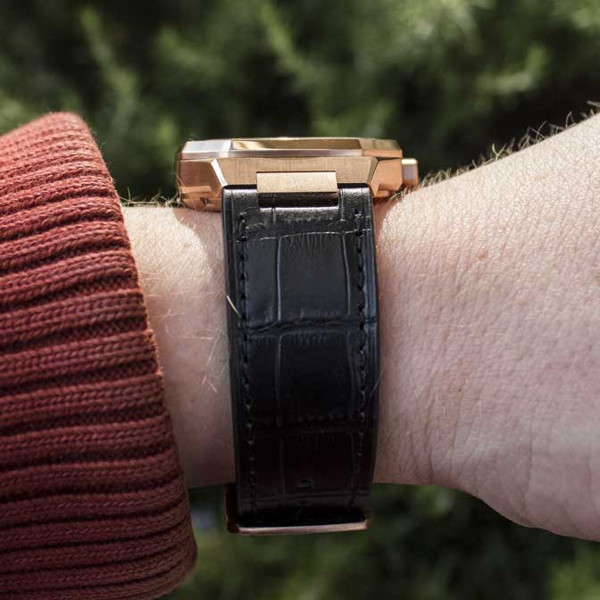 The leather strap is thick, substantial, and comfortable. The alligator texture gives it a touch of luxury and it doesn’t take long to break in. However, the buckle could be slightly wider to prevent it from rubbing against the sides of the strap. An optional deployant clasp would be a nice addition to the collection, allowing buyers to upgrade the watch’s comfort and functionality.